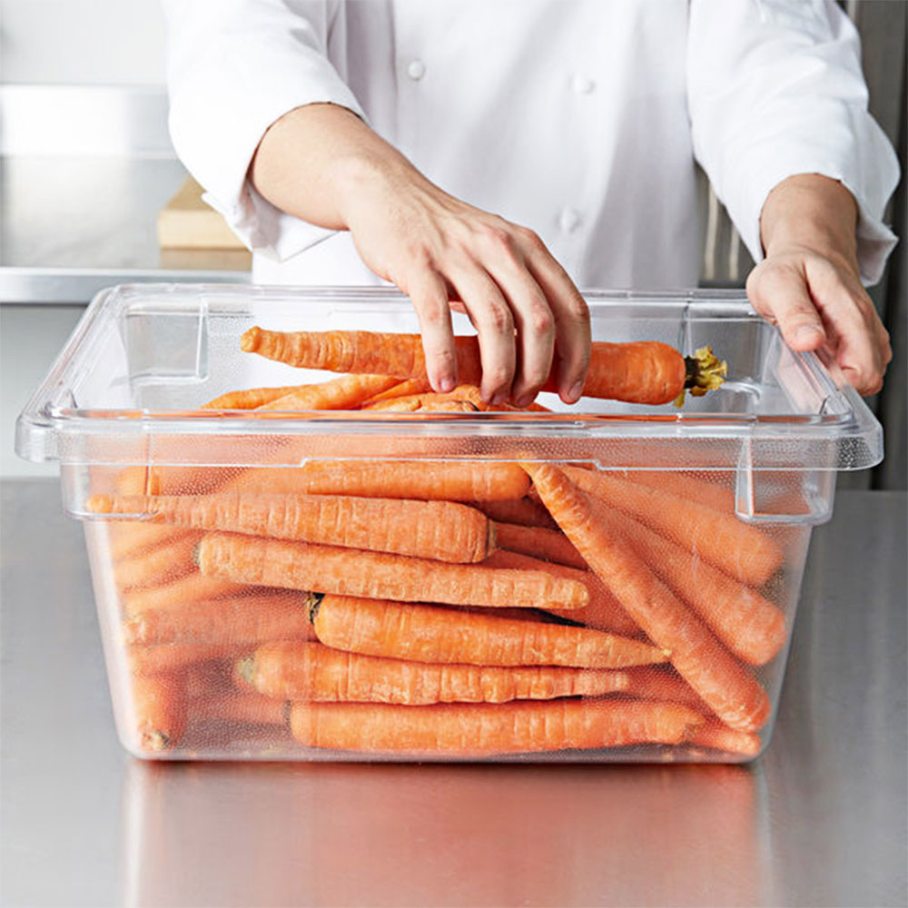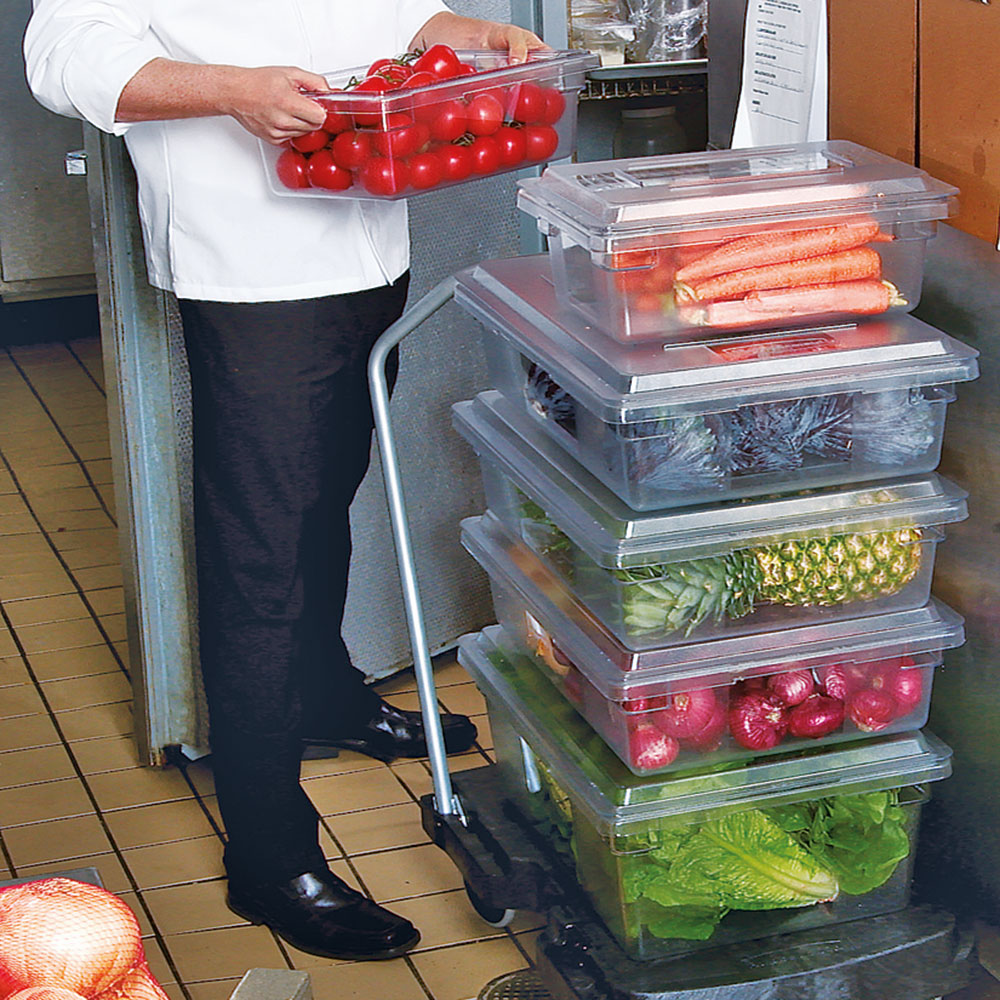 Spülmaschinenfester und gefrierschrankgeeigneter Lebensmittelbehälter von Rubbermaid. Dieser Behälter ist ideal für die Aufbewahrung von Fleisch, Obst und Gemüse. Hergestellt aus hochwertigem, durchsichtigem Polycarbonat (PC). Ein Datumkontrollfeld auf der Box bietet eine übersichtliche Lagerhaltung. Der optional erhältliche, dicht aufliegende Deckel mit Schnappverschluss sorgt für gute Hygiene. Dieser Lebensmittelbehälter ist ideal für die GN-Zubereitungswagen von Rubbermaid geeignet.