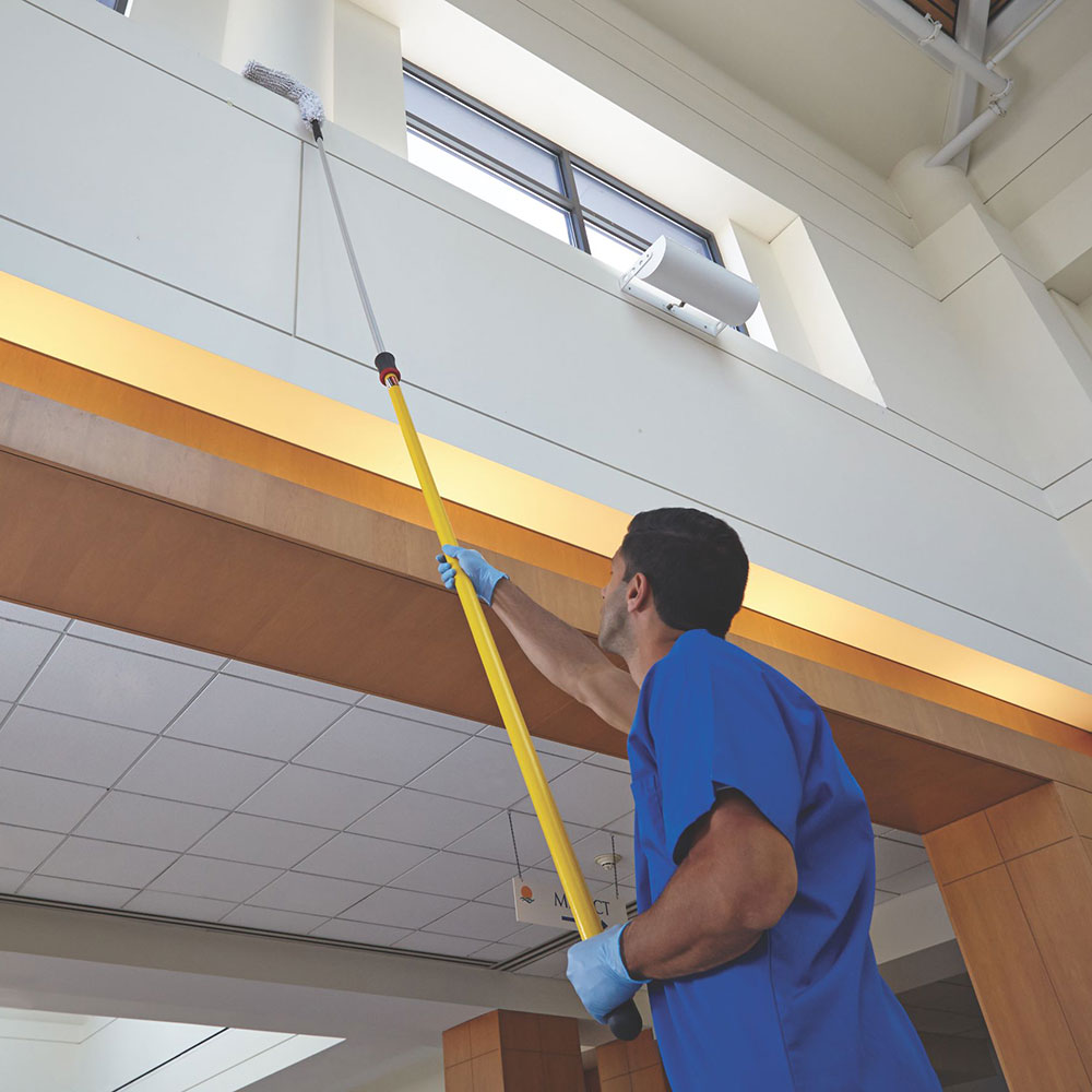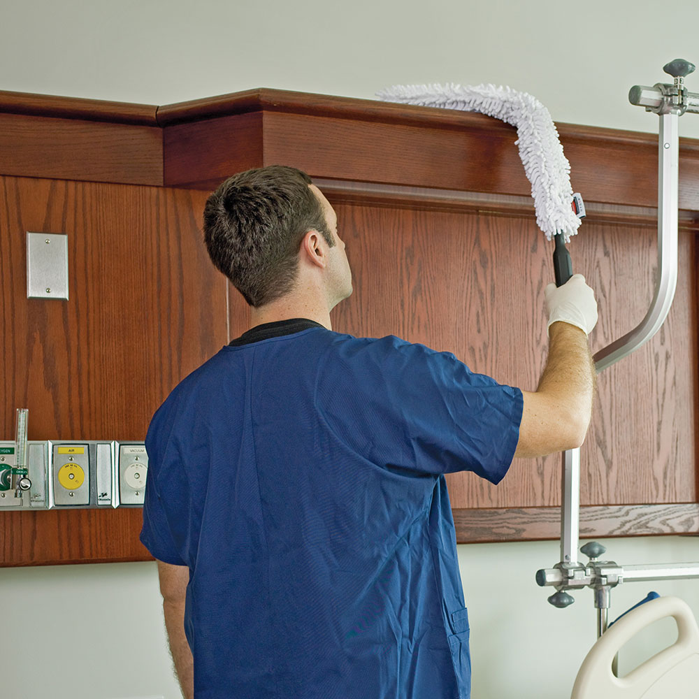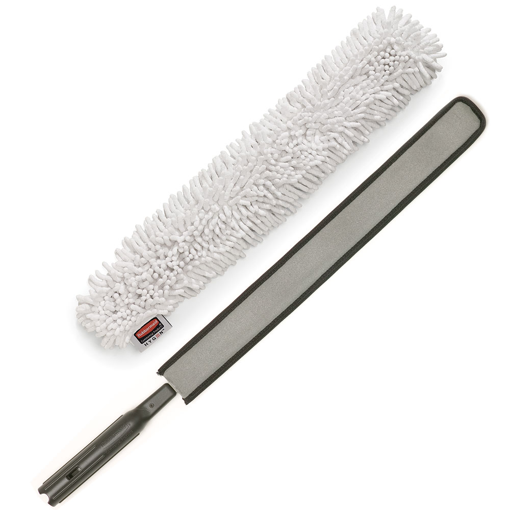 Das Hochleistungs-Staubmopp-Set von Rubbermaid HYGEN kann trocken oder feucht verwendet werden. Ideal für stärker verschmutzte Bereiche und zur Entfernung von Haaren. Extrem lange Lebensdauer. Der Überzug verträgt 500 Waschgänge bei 95°C und 500 Trocknungsgänge bei 60°C, bzw. 200 Durchgänge mit Bleichmittel. Ein Klettverschluss und Elastikband gewährleisten gute Befestigung des Überzugs. Der Schnellverbindungsmechanismus für einen Teleskopstiel verwandelt den Handmopp in ein ausziehbares Reinigungsgerät.